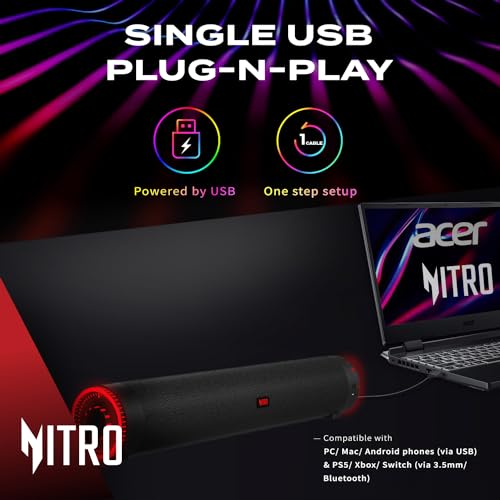 Features: - Free Your Head from Headphones: Experience immersive audio without the hassle of headphones. From sharp sniper shots to powerful explosions, this compact yet powerful soundbar elevates your gaming experience. - Advanced Nitro Pulse RGB Lighting: Celebrate your victories with customizable RGB lighting effects that sync with your gameplay, creating the perfect atmosphere for every moment. - Compact and Space-Efficient Design: At 16.5 inches long, this soundbar fits perfectly under your monitor, offering rich stereo sound without taking up much space. - Effortless USB Plug-N-Play for PC & Mac: Simplify your setup with a single USB-C or USB-A cable that provides both power and audio. No additional 3.5mm connection needed. - Seamless Connection with Android Phones: Enjoy better audio on the go by plugging the included USB-C cable into your Android smartphone. - Versatile Connectivity: Use Bluetooth 5.0 for wireless connections to phones, tablets, gaming consoles, and laptops, or connect via the included 3.5mm audio cable for a wired setup. - Customizable EQ Profiles: Optimize your audio by switching between Game, Movies, and Music modes for a fully immersive experience tailored to your activity.